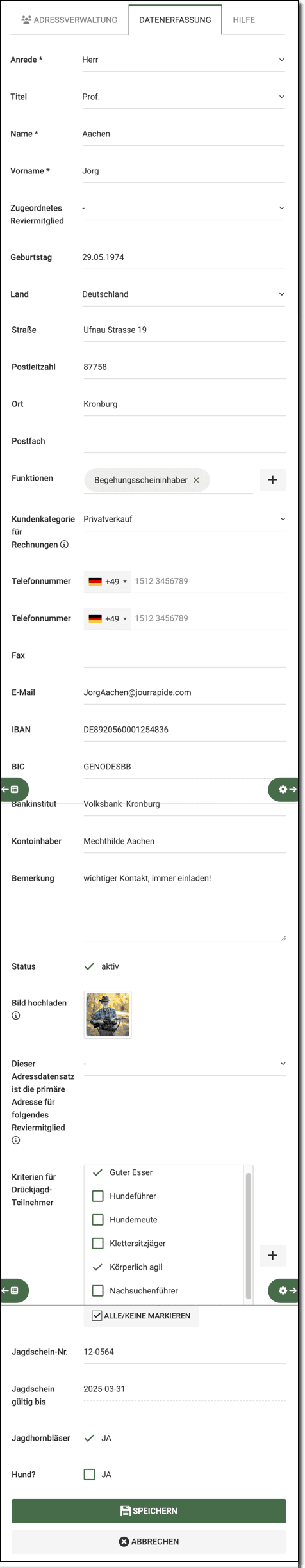- Jagdschein-Nr. und Jagdschein gültig bis können hier eingegeben werden.