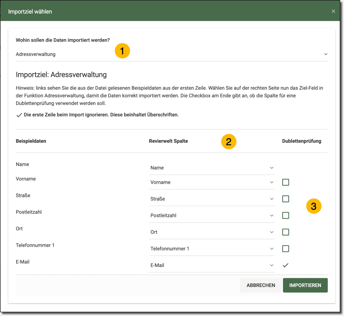 Beim Adressimport kann optional eine Dublettenprüfung aktiviert werden. Diese sorgt dafür, dass bereits vorhandene Datensätze nicht erneut importiert werden, wenn sie bereits im System vorhanden sind.