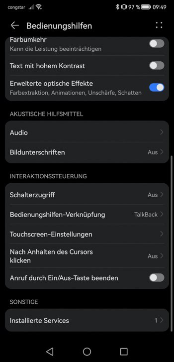 Gehen Sie in das Menü Einstellungen und deaktivieren Sie Bedienhilfen. Danach wird die Wildportal-App wieder fehlerfrei funktionieren. Die Abbildung unten kann je nach Android-System unterschiedlich aussehen. Suchen Sie nach dem Stichwort Bedienhilfen.