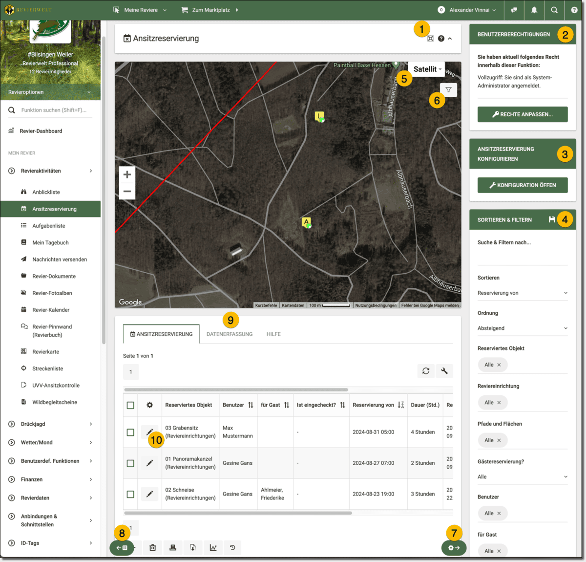 - Hier können Sie – sofern Sie die notwendige Berechtigung haben – die Ansitzreservierung konfigurieren.