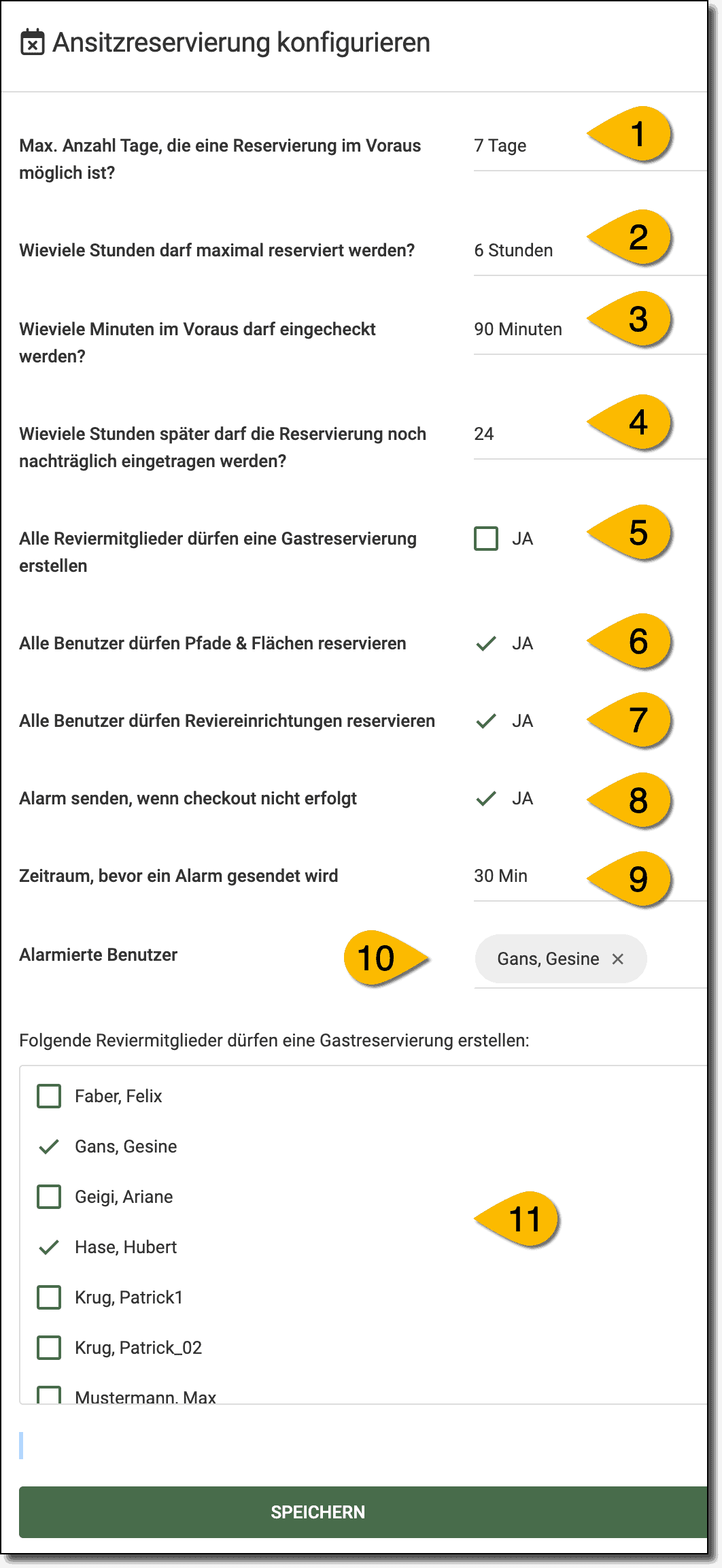 - Legen Sie fest, ob Ihre Reviermitglieder für Gäste eine Reservierung anlegen dürfen. Unten können Sie dann auswählen, welches Reviermitglied das tun darf.