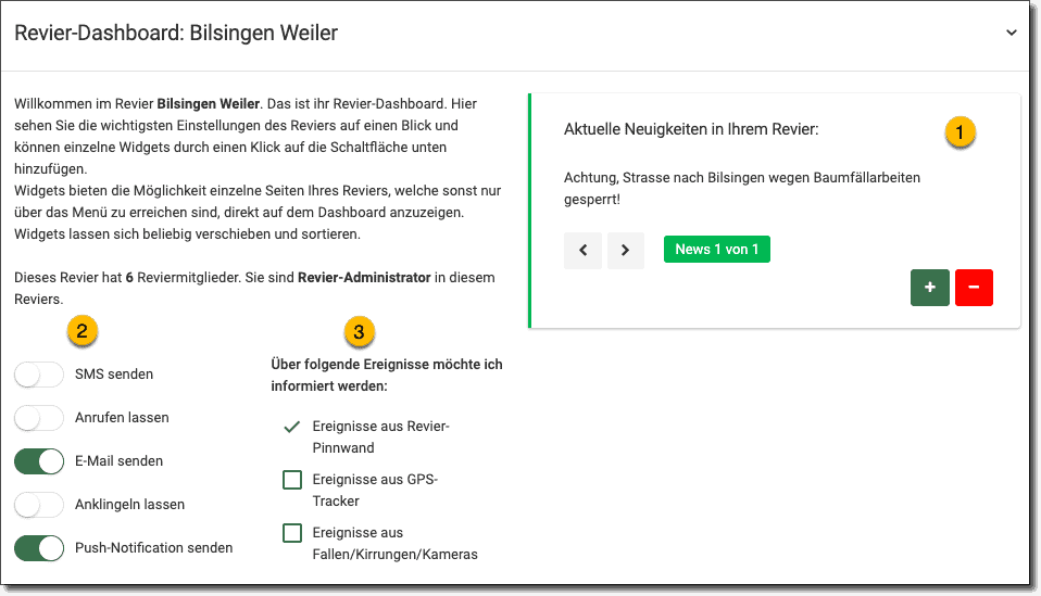 Sobald Sie sich in die Wildportal eingeloggt haben und ein Revier betreten, erscheint die Startseite dieses Reviers, das sogenannte Dashboard. Hier können Sie diverse Einstellungen vornehmen, wie beispielsweise die Benachrichtigungsoptionen einstellen.