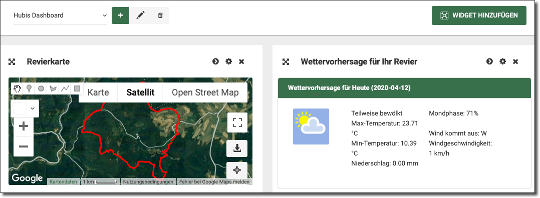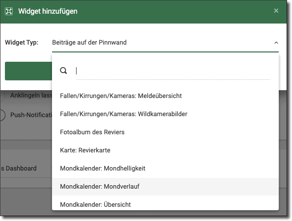 Mit sogenannten Widgets – das sind bestimmte Funktionen aus der Wildportal – können Sie die Revier-Startseite, das Dashboard, individuell gestalten.