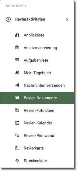Um Dokumente in einem Revier zu sammeln oder zu verwalten, wählen Sie im Reviermenü unter MEIN REVIER -> Revieraktivitäten-> Revier-Dokumente.